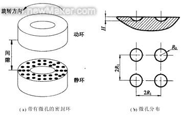 多孔端面機(jī)械密封的結(jié)構(gòu)多孔端面機(jī)械密封結(jié)構(gòu)如圖1(a)所示。動(dòng)環(huán)為平端面密封環(huán),靜環(huán)平端面上均勻地布置著規(guī)則的微孔,形成多孔端面。微孔為圓孔、橢圓孔或圓錐孔,圖1(b)為端面上正方形分布的圓孔的情形??讖綇膸孜⒚字翑?shù)百微米,孔深從幾微米到幾十微米,孔隙率(孔面積占整個(gè)端面面積的百分?jǐn)?shù))為5%~30%。多孔端面的表面粗糙度與靜環(huán)的表面粗糙度相同,Ra均為0.01~0.02μm[6]。