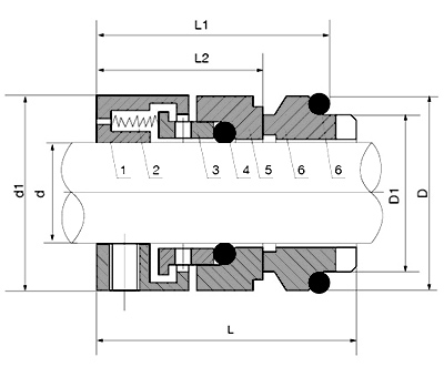 結(jié)構(gòu)特點(diǎn): 內(nèi)裝、單端面、多彈簧、非平衡型、撥叉?zhèn)鲃?dòng) 應(yīng)用范圍: 溫 度 : -20~200 ℃ 壓 力: 0.8Mpa 線速度 : 15m/sec 介質(zhì) : 油類、水和一般腐蝕性液體 型號(hào)MODEL D D1 D2 D3 L1 L 116U-35 35 49 44 50 42.5 3...